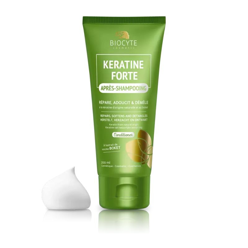 Biocyte kératine forte® conditioner contains natural keratin and vegetable proteins. It repairs, softens and unravels the hair. This product has been formulated with Boket extract, an Asian plant traditionally used for its cleansing, smoothing action and for the shine and density of the hair.