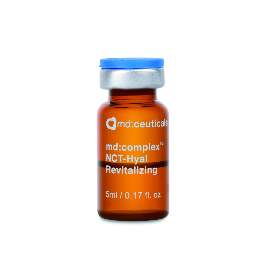 md:complex NCT-Hyal Revitalizing combines the properties of Hyaluronic acid with the application of essential micronutrients, amino acids, vitamins, co enzymes, minerals and nucleic acids that revitalises and deeply moisturises tired and dull skins with lack of glow, luminosity, tone and elasticity, restoring skin youthful appearance and revealing radiant and smooth complexion.